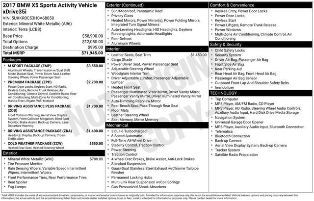 White Metallic 2017 BMW X5 xDrive35i Sport Activity AWD 8-Speed Automatic 3.0L I6 DOHC 24V TwinPower Turbo Terra Leather.Recent Arrival! Odometer is 849 miles below market average!Call us today to schedule your VIP test drive!