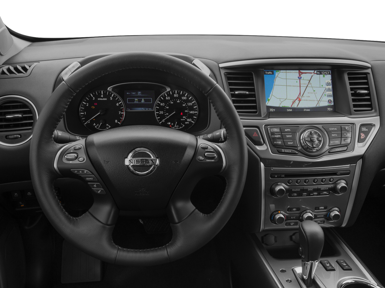 - Radio: AM/FM/CD w/NissanConnect Navigation -inc: 8" color display w/multi-touch control, voice recognition for audio, Bluetooth® and vehicle information, including music search by voice, HD Radio, SiriusXM satellite radio, USB connection ports (2) for iPod interface and other compatible devices, SiriusXM Travel Link (weather, fuel prices, movie listings, stock info and sports), Bluetooth® hands-free phone system, streaming audio via Bluetooth®, hands-free text messaging assistant and RCA AUX input (inside center console), NissanConnect w/Navigation and services includes voice recognition for navigation, one-shot voice destination entry, SiriusXM Traffic and digital clock, NissanConnect Services powered by SiriusXM includes automatic collision notification; emergency call and stolen vehicle locator; remote services including start/stop, lock/unlock, flash lights, sound horn; customizable alerts including drive zone, valet, curfew and speed alerts; dealer service scheduling and maintenance alerts, 6 speakers, Radio Data System (RDS), MP3/WMA CD playback and Speed Sensitive Volume control (SSV)