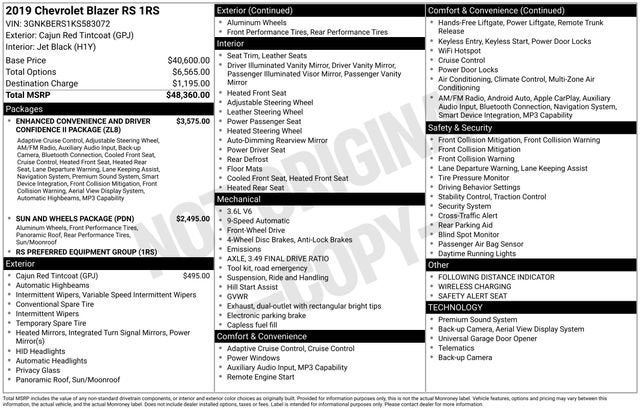 Recent Arrival! 20/26 City/Highway MPGElevate your driving experience with this 2019 Chevrolet Blazer RS, a captivating SUV that seamlessly blends style, performance, and advanced technology. Boasting a sleek Cajun Red Tintcoat exterior, this Blazer RS commands attention on the road, exuding a bold and confident presence.Highlights of this exceptional vehicle include:• Enhanced Convenience and Driver Confidence II Package• Sun and Wheels Package• Panoramic Power Sunroof• 21 Gloss Black Aluminum Wheels• Wireless Charging• Bose Premium 8-Speaker Sound System• Rear Camera Mirror• Adaptive Cruise Control• Forward Automatic Braking• Lane Keep Assist with Lane Departure WarningStep inside and you'll be greeted by a cabin that showcases Chevrolet's commitment to exceptional craftsmanship. Perforated leather-appointed seats provide unparalleled comfort, while the heated and ventilated front seats and heated rear outboard seats ensure you and your passengers stay cozy in any weather. The 8-inch diagonal Chevrolet Infotainment 3 Premium system with connected navigation keeps you seamlessly connected, while the HD Surround Vision and Rear Camera Mirror provide enhanced visibility and peace of mind.Powered by a robust 3.6L V6 engine paired with a smooth-shifting 9-speed automatic transmission, the Blazer RS delivers a dynamic and responsive driving experience. With 20 city/26 highway MPG, this SUV strikes the perfect balance between power and efficiency, making it an exceptional choice for your daily commute or weekend adventures.Whether you're seeking a stylish family hauler, a capable road trip companion, or a versatile SUV that can handle your active lifestyle, this 2019 Chevrolet Blazer RS is the answer. Experience the difference for yourself and schedule a test drive today.This vehicle is located at Navarre Chevrolet, 1300 East College Street, Lake Charles, LA 70607. Please call any of our Sales Professionals at 337-474-1999 for more details or to set an appointment!