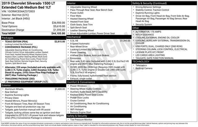Recent Arrival! Clean CARFAX.Experience the power and capability of the 2019 Chevrolet Silverado 1500 LT. This rugged yet refined pickup is the perfect companion for your toughest tasks and your most adventurous journeys.Key features of this Silverado include:• TEXAS EDITION package with Convenience, Locking Differential, and Trailering features• 20 painted aluminum wheels• Powerful 5.3L V8 EcoTec3 engine with Dynamic Fuel Management• Locking rear differential, heavy-duty suspension, and other towing/hauling upgradesInside, you'll find an impressive array of comfort and technology features:• Chevrolet Infotainment 3 system with Apple CarPlay and Android Auto• Dual-zone automatic climate control• Heated front seats and heated steering wheel• Rear vision camera and rear park assistWith its rugged good looks, impressive capabilities, and thoughtful amenities, this 2019 Silverado LT is ready to take on any task or adventure. The Texas Edition package adds an extra touch of style and functionality to make this truck truly stand out.Whether you're hauling the family, towing a trailer, or exploring the great outdoors, the Silverado 1500 LT has the power, versatility, and comfort to get the job done. Experience the difference a Silverado can make in your daily driving and weekend adventures.This vehicle is located at Navarre Chevrolet, 1300 East College Street, Lake Charles, LA 70607. Please call any of our Sales Professionals at 337-474-1999 for more details or to set an appointment!